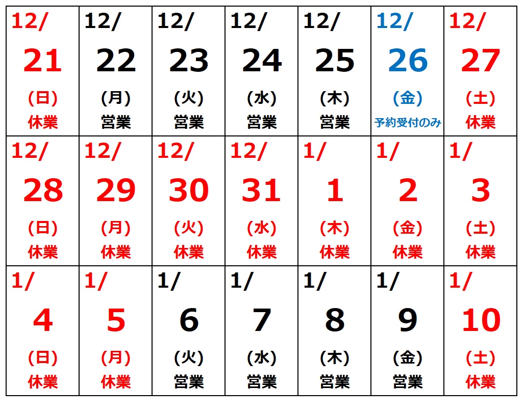 (年内最終営業日の12月26日は、午前のみ予約受付対応とさせて頂きます。)